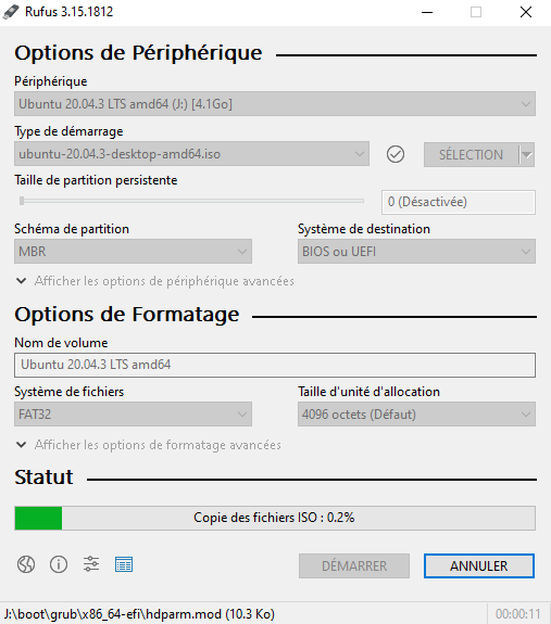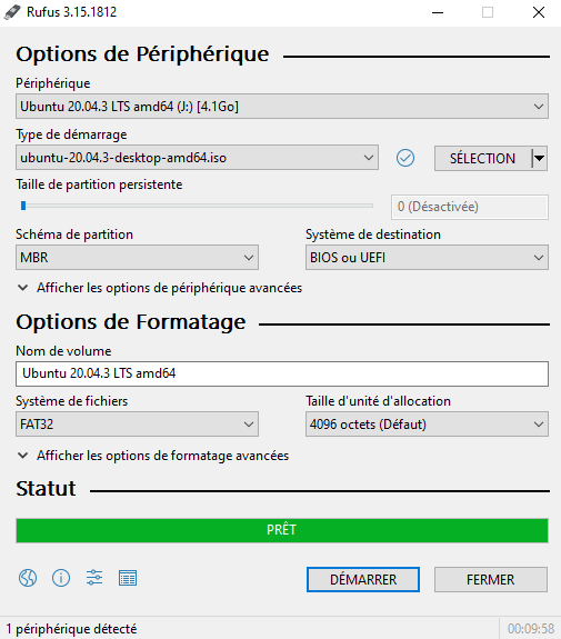 3 – Cliquez sur le bouton Démarrer pour lancer la création de la clé USB d’installation de Linux.